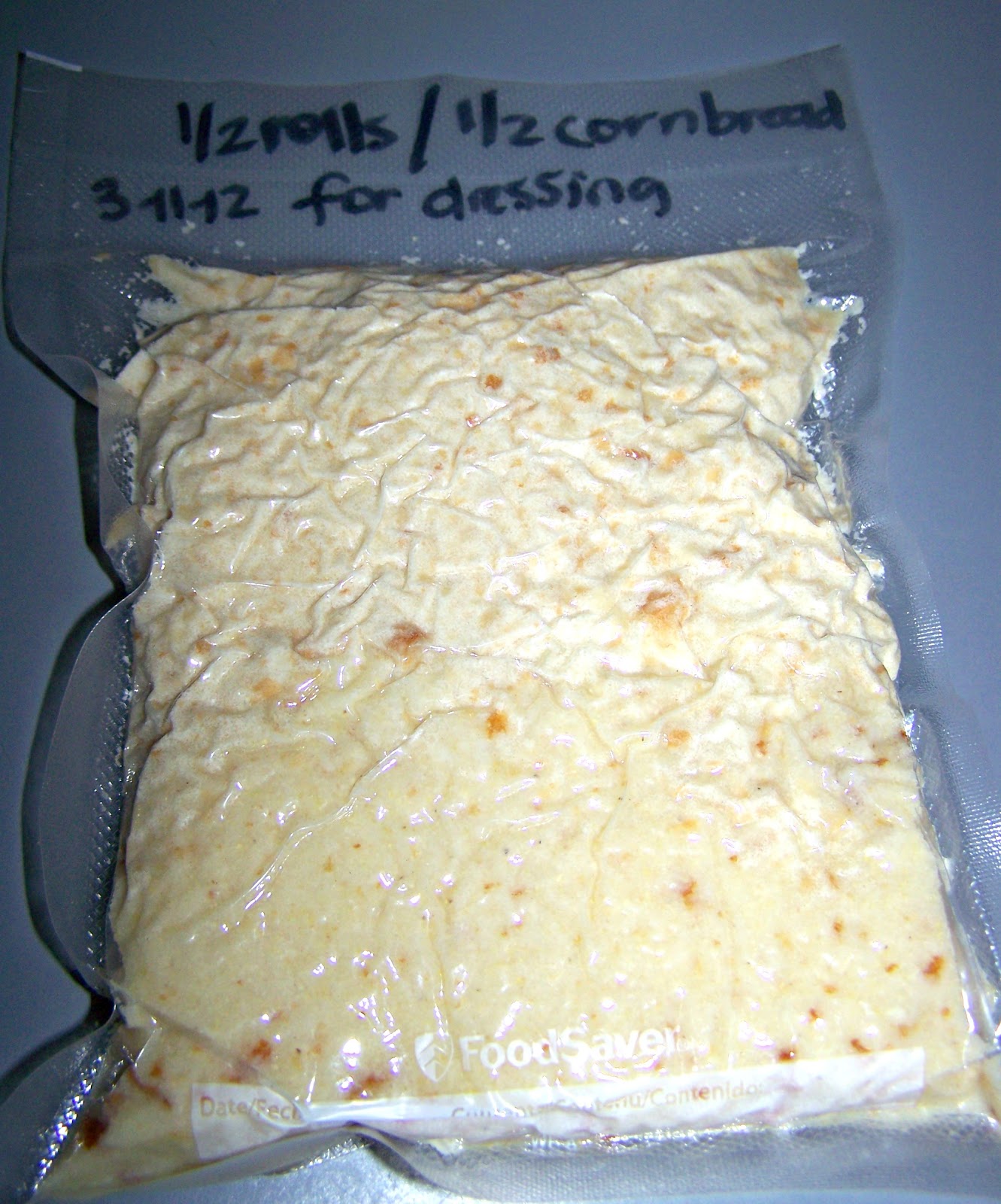 To dry bread overnight, crumble cooled cornbread into small pieces and put it in a large plastic bag.
